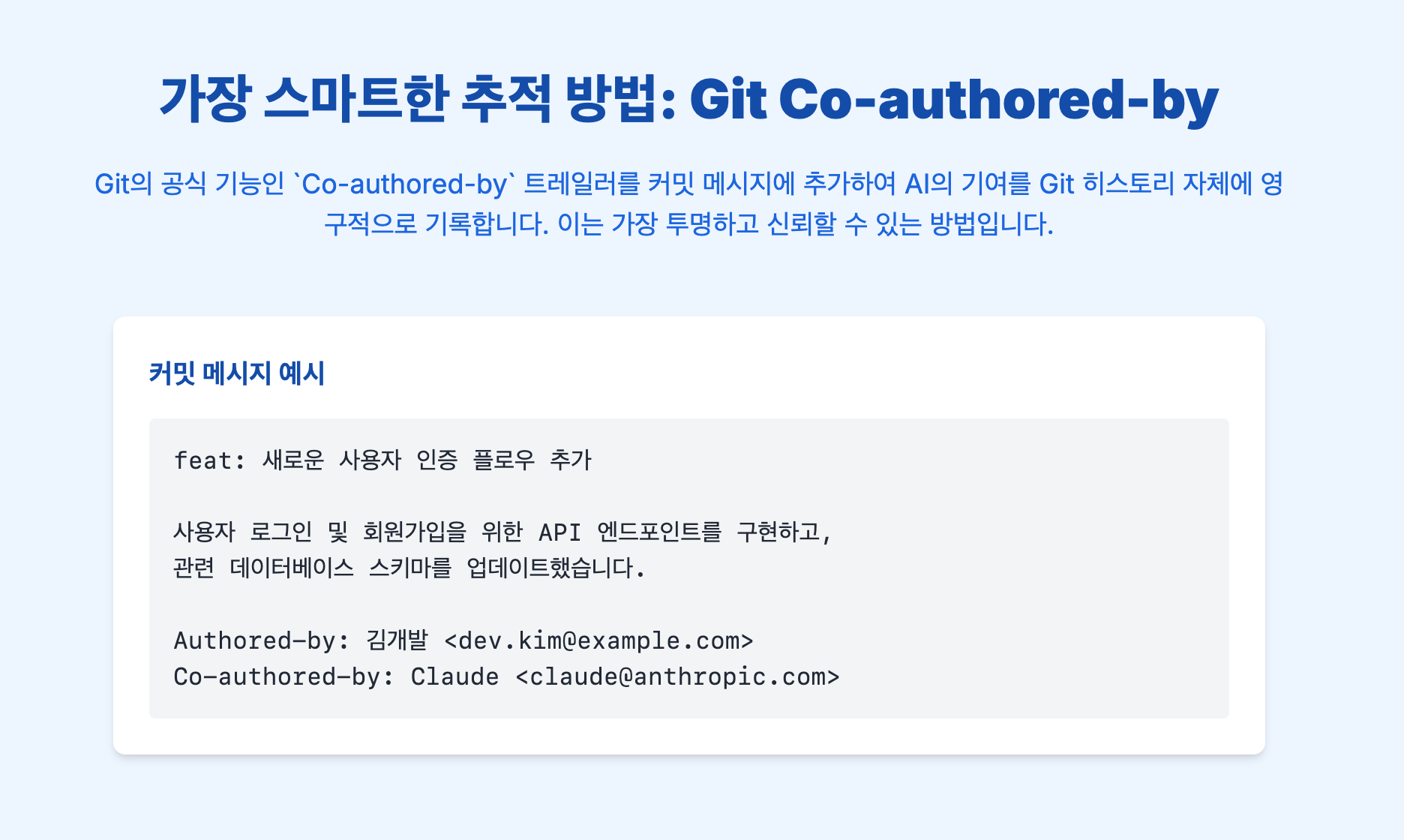바로 Co-authored-by 트레일러를 커밋 메시지에 추가하는 방식은 기술적으로 매우 훌륭하고 실현 가능성이 높습니다. 왜냐하면 Git의 강력한 기능을 그대로 활용하기 때문이죠.