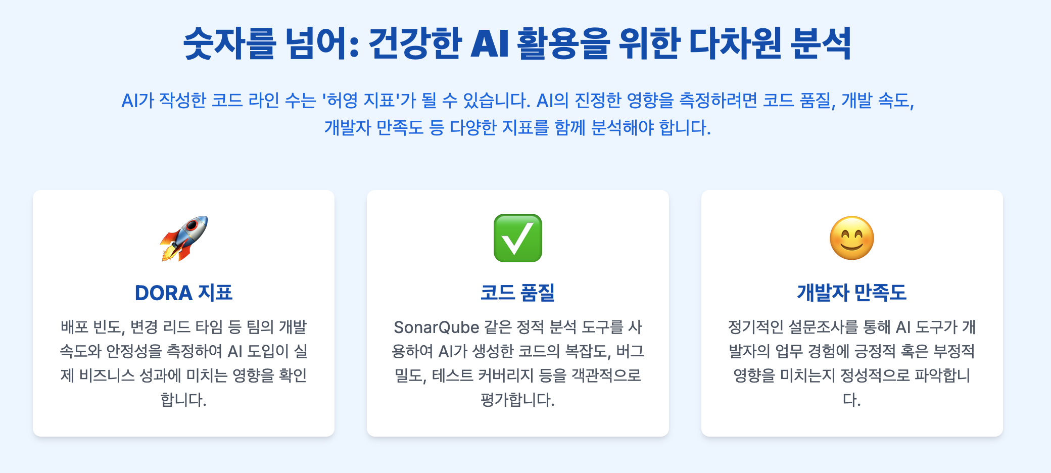 - 다차원적으로 분석하기: 코드 라인 비율뿐만 아니라 DORA 지표, 코드 품질, 개발자 만족도 등 다양한 지표를 함께 추적하여 AI의 진정한 영향을 파악하세요.
